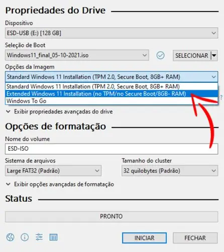 5. No campo “Opções da Imagem”, você deve selecionar “Extended Windows 11 Installation (no TPM/no Secure Boot/8GB- RAM)”. Essa é a forma certa para você criar um pendrive de instalação sem os requisitos oficiais do sistema operacional;